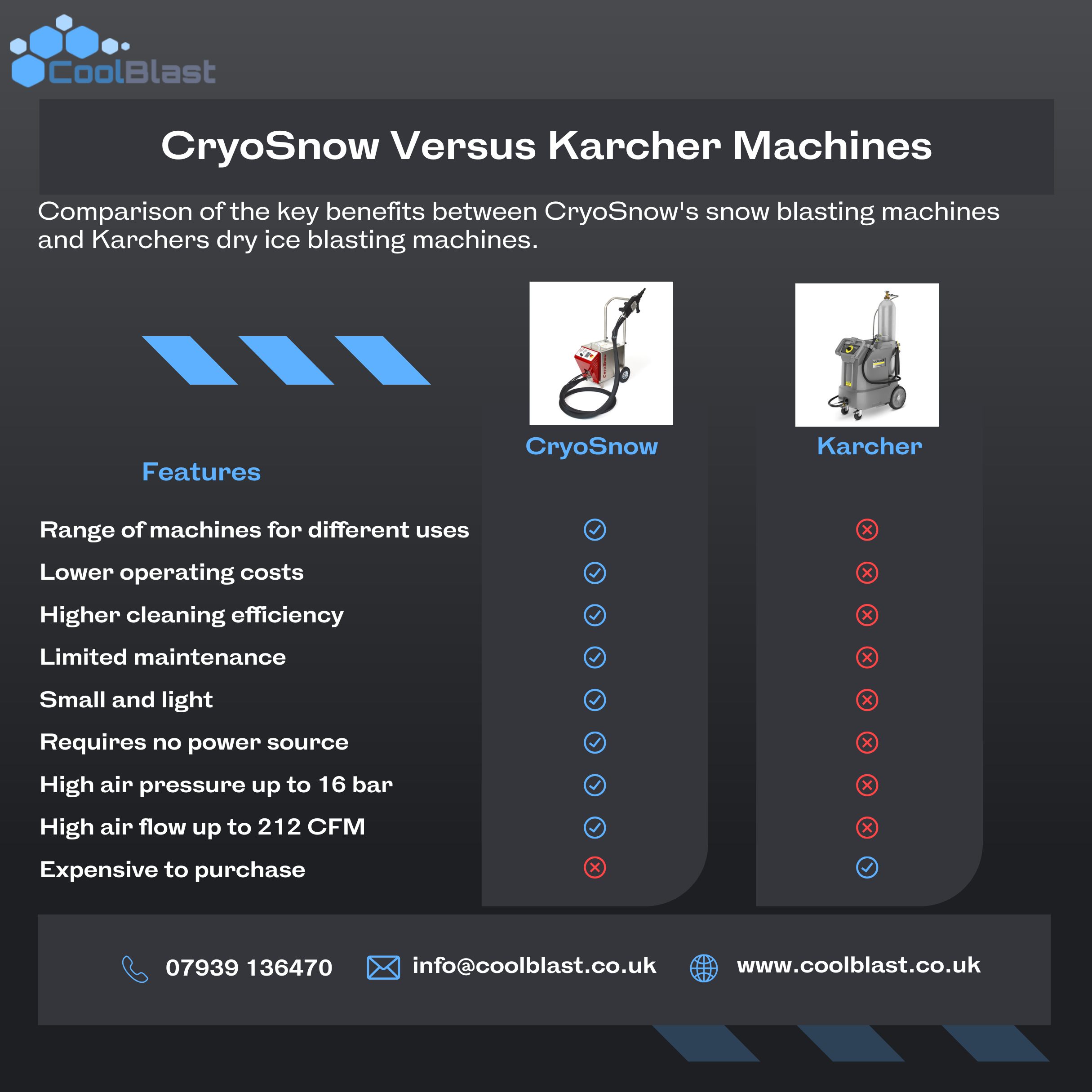 CoolBlast’s dry ice blasting machines utilise innovative technology to produce dry ice on-demand from liquid CO₂— eliminating the need for pre-manufactured pellets and providing faster, more efficient cleaning with minimal downtime.